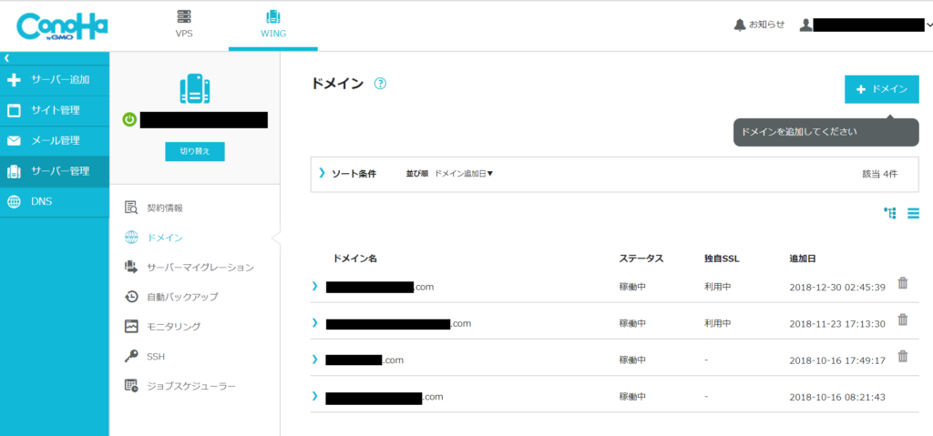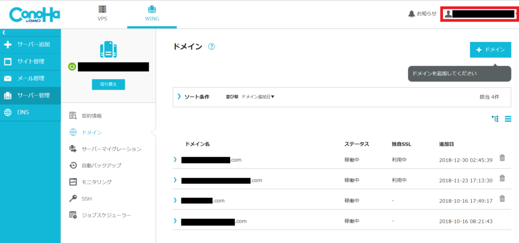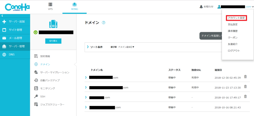ConoHaWINGのデフォルトの管理画面