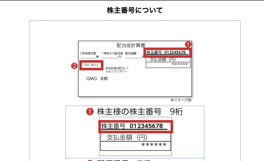 ①の株主番号は、送られてくる配当金計算書の右上に書いてあります。