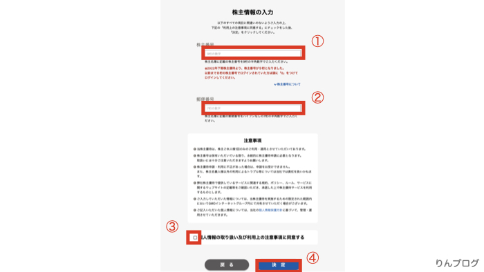 株主番号や郵便番号の入力が終わると、決定ボタンが押せます。