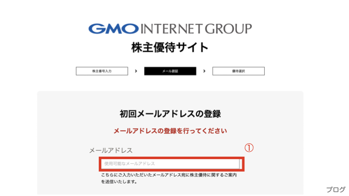 3. メールアドレス:株主優待申込で入力したのと同じアドレスを入力する