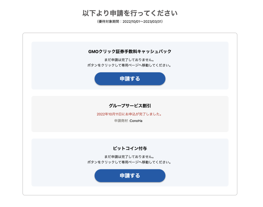 GMOの株主優待では、ConoHaの他にも、GMOクリック証券など複数の優待を申し込みできます。